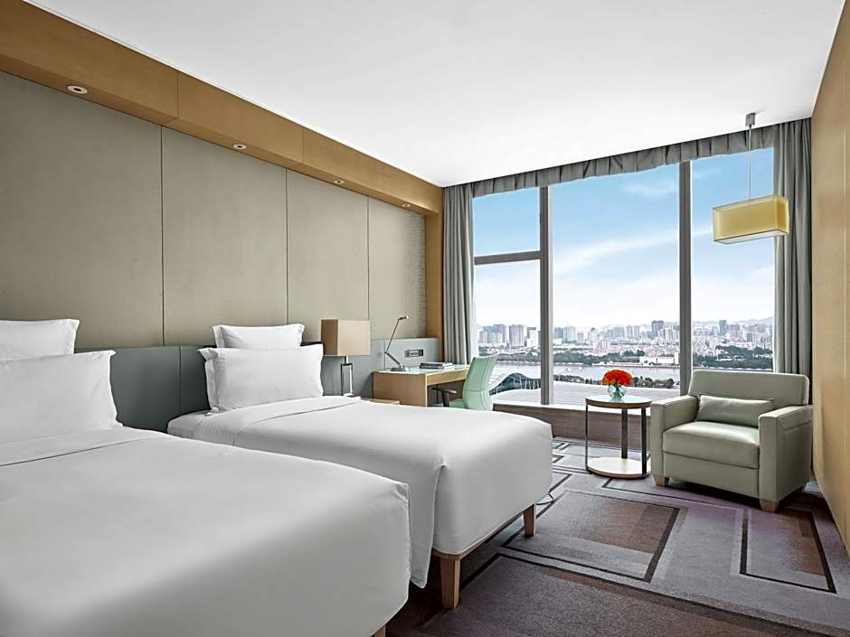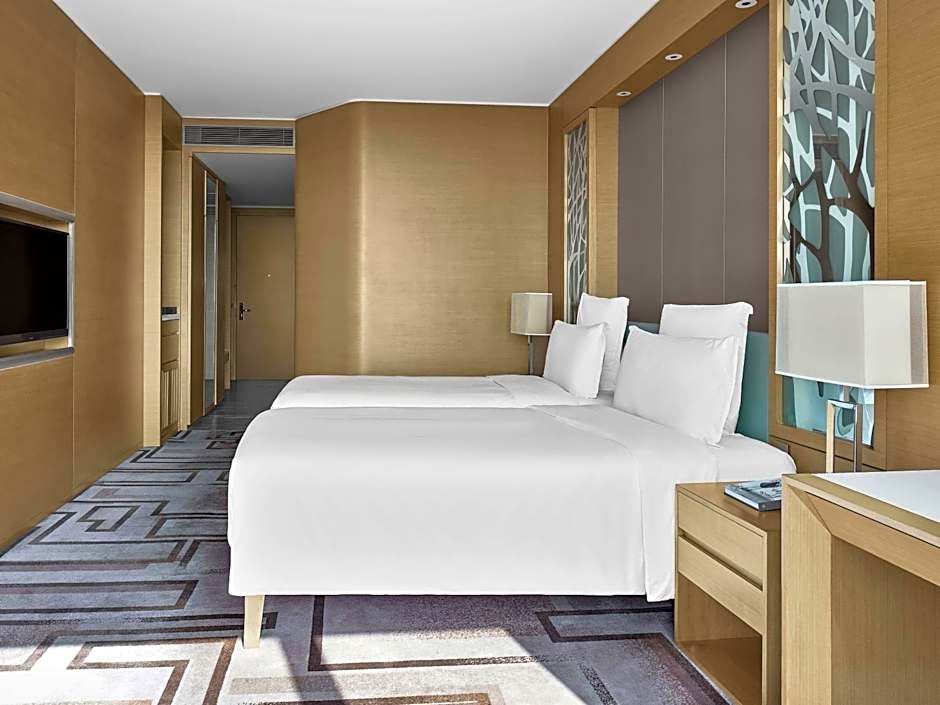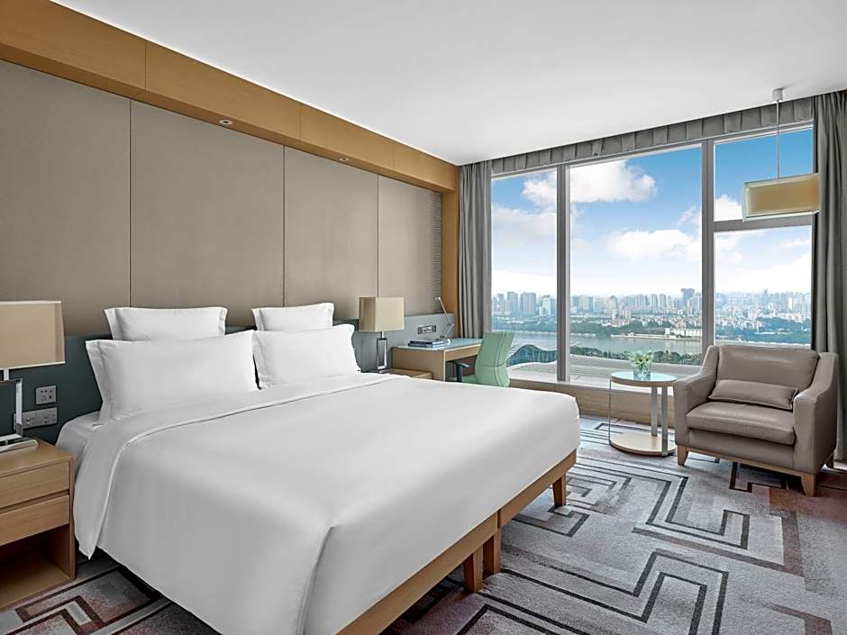 Located on floors 12-19, every room is decorated in a warm color palette of beiges and grays, accented by rich textiles, and elegantly furnished with modern furniture. Each features our signature Blissful Bed and oversize marble bathroom. The floor-to-ceiling windows offering views of Guangzhou.